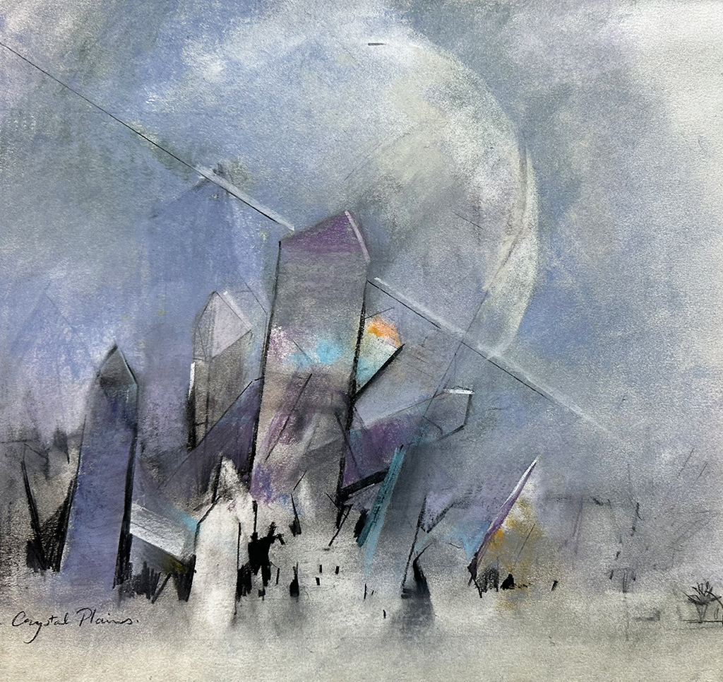 This is a pastel sketch for John’s idea of ‘The Crystal Plains’. More preliminary sketches this from a recent batch from him for sale now.